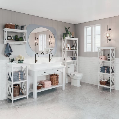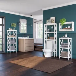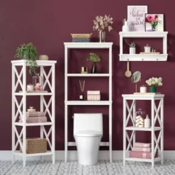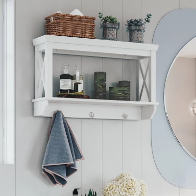 Keep items neatly organized and displayed on this stylish wall shelf with hooks. This simple, yet contemporary cross-frame design adds instant function to your space with two open shelves and three hooks. Utilize in the bathroom for towels, extra wash cloths and toiletries, or in the entryway for coats, dog leashes and stylish entry decor. Includes detailed step by step instructions for easy assembly and installation. Pair with the additional items in the RiverRidge® Home La Crosse Collection to give your space an organizational makeover.