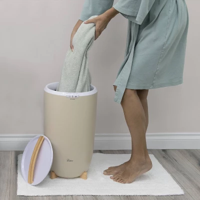 Every day is a spa day with this oversized bucket style towel warmer. Stay toasty on cold mornings, dry off after a long bath or shower, or beat chilly evenings in luxurious warmth. Available with natural bamboo water transfer accents, this extra-large towel warmer accommodates up to two 40’’ x 70’’ bath towels, robes, or your favorite throw blanket. Auto shut off feature ensures safety, with four timer settings to choose from 15, 30, 45 or 60 minutes. A single temperature setting provides the optimal heat every time. Lightweight and easy to carry, this freestanding towel warmer can be placed anywhere in the home. The handy built-in cord storage in the base keeps the extra-long power cord completely hidden when not in use, while the slim profile allows for easy storage in a closet or underneath a bathroom countertop.
