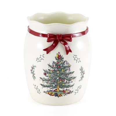 The new Spode Christmas Tree Wastebasket by Avanti features the iconic Christmas tree on a white base with a red ribbon tied around the top. Crafted in resin. Imported.