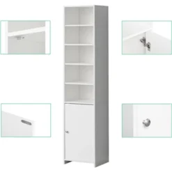 Your bathroom’s organization starts with this freestanding bathroom furniture cabinet. Modern and contemporary design for bathroom storage and dcor. Offers 5 open display shelves and 2 adjustable shelves in the cabinet for different preferred levels. This cabinet holds bathroom essentials accessible neat and clean.