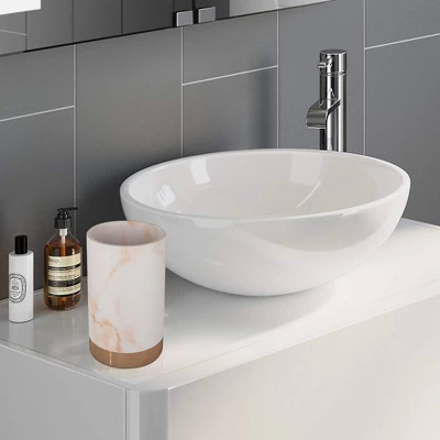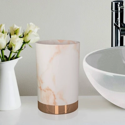 Misty Copper Made out of resin and metal. Resin look is inspired from the Italian marble called Michaelangelo. Metal part is in copper finish. Perfect for end tables, night stands, counter tops, vanities and desks throughout your home. This bath accessory set is sure to elevate the look of any bathroom decor and also add functionality and durability.