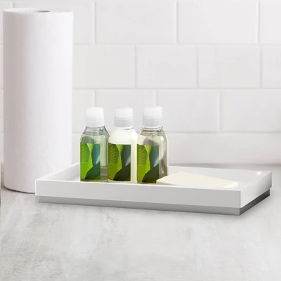 - A compact footprint allows each accessory to fit even the most crowded counter spaces. Hardy resin is chosen for its ability to last years in moisture-rich environments, and the White resin with a stainsteel steel trim finish does not fade even when in contact with bare hands, water, or soap.