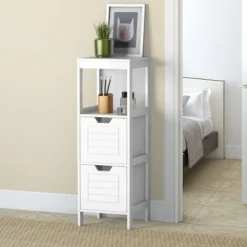 The simple and modern style of our floor cabinet, can show your elegant temperament and enhance your quality of life. You can put it in the bathroom, living room, bedroom, office and lounge. It has a total of three floors, and you can hide privacy items in two drawers. Drawer handles are hollowed out, which can ensure the safety of your kids. It is made of MDF P2 board, which is wear-resistant, strong in load-bearing capacity and durable. The stable support legs design makes the structure stronger. The smooth surface is easy to clean and maintain. And you can assemble it in a short time.