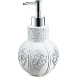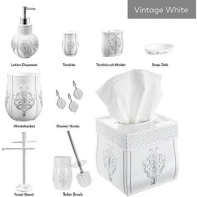 Are you looking for a bathroom accessories set that easily blends with your existing color scheme and decor?Would you like a set that is both durable and stylish, while designed to outlive short term interior design and decor trends?Introducing the perfect bathroom accessories set – The Vintage White Collection!Manufactured with high quality resin material, each piece features raised and finely detailed French fleur de lis motifs on a curvy, surface; flawless work of art that exudes a vintage look and feel that will never go out of fashion. The finishing is smooth, glossy white; which perfectly lends itself to any color scheme and turns your bathroom into a sanctuary of sophistication. The collectionâs matching pieces include a 7.75âx 4.25âx 4.25â dispenser thatâs great for lotion or liquid soap/ facial wash, a toothbrush holder with tumbler and a soap dish. You will not need any other accessory to conveniently keep your personal bathroom effects in one place. The setâs glossy white finished resin material makes it super-easy to wash with just soap and water, without corroding, scratching or wearing out the detailed design artistry.Some of its most notable advantages include:Excellently crafted for timeless elegance.Stores bathroom accessories in a convenient but stylish way.Long lasting without going out of fashion.Universal finishing that blends with existing decor. Wouldnât you like to turn your bathroom into an oasis of timeless elegance with a set of accessories created out of high quality materials and artistic craftsmanship?Click “ADD TO CART” now to flaunt your good taste and sense of style!