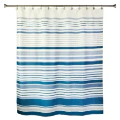 The bold painterly look of the Cubes Stripe Shower Curtain will add a modern update to your shower. Printed on a textured box weave fabric, the design has a rustic quality with irregular lines and texture within the stripes. Contemporary blues and grays add to the modern design. Update your bathroom with the Cubes bathroom ensemble.