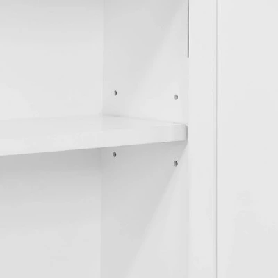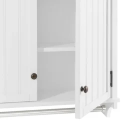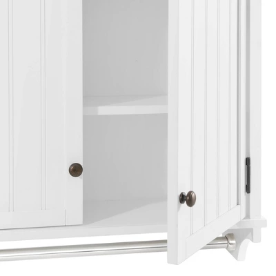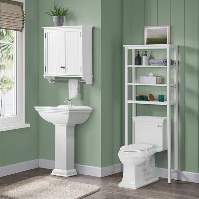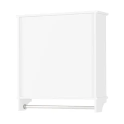 This collection brings space saving storage to your bathroom. The classic design compliments almost any bathroom décor. Wood construction with a white, painted finish, these pieces are designed for both style and functionality. Store toiletries, stacked washcloths, rolled towels or anything you need to keep organized. The wall mounted storage cabinet includes two adjustable interior shelves and a towel bar for maximizing space. Bath collection is moisture resistant.