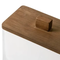 - Made of chunky frosted glass, removable wood lid with knob in a rich dark grain finish Finished size: 4.53" x 2.54" x 4.10" Use to hold cotton balls, swabs and other personal items protecting them when covered