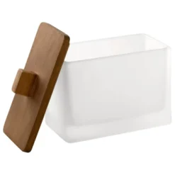 - Made of chunky frosted glass, removable wood lid with knob in a rich dark grain finish Finished size: 4.53" x 2.54" x 4.10" Use to hold cotton balls, swabs and other personal items protecting them when covered