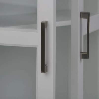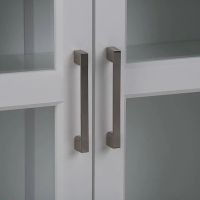 - Features two (2) doors with one (1) adjustable interior shelf and three (3) open cubbies. Contemporary Brushed Nickel handles