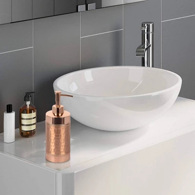- The round, compact design fits on most bathroom sinks and countertops – even small pedestal sinks.