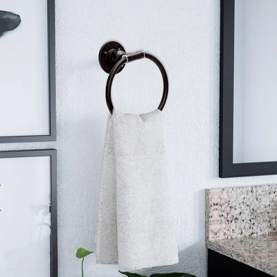The Kimball Towel Ring is easy to install and holds hand and drying towels, keeping them off the floor or vanity. This model installs directly onto a wall and features a satin black finish. Hang above a toilet, on a door or along a wall. A standard mount and concealed screws are included for easy installation. The Kimball Collection features matching towel bars, a toilet paper holder and robe hook for a complete bathroom set. This product comes with a 1-year limited warranty