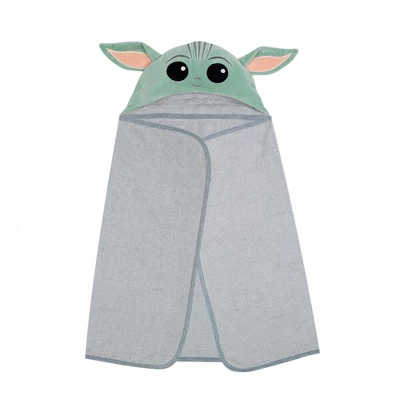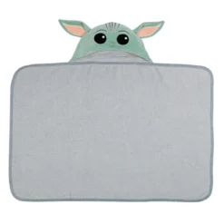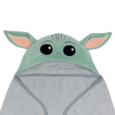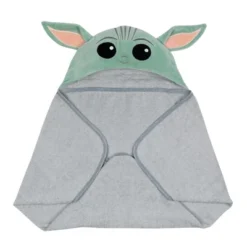 Your little padawan will love being wrapped in this soft and cozy Star Wars Mandalorian Baby Yoda hooded towel. The hood is velour and is lined in cotton terrycloth. The pure cotton terry towel is absorbent, and the binding is a dyed to match cotton jersey. Celadon green velour was used for the Child’s face along with embroidered silver-gray satin stitches. The gray hooded towel is 34” wide X 23” high and is recommended for babies up to 30 pounds. This makes an amazing baby shower gift or welcome home baby gift.