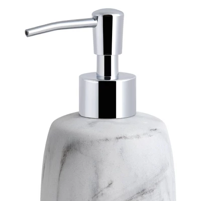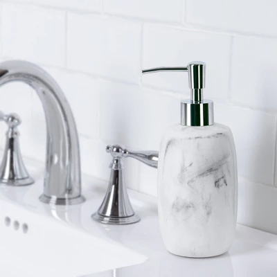 - Hotel inspired marble look soap/lotion pump in white with grey/black vein detailing, brings refreshing style to your spa-like bathroom
