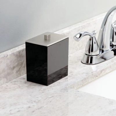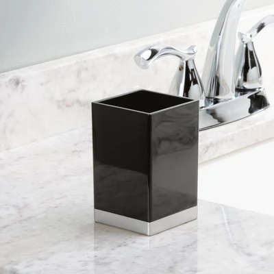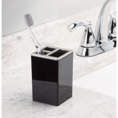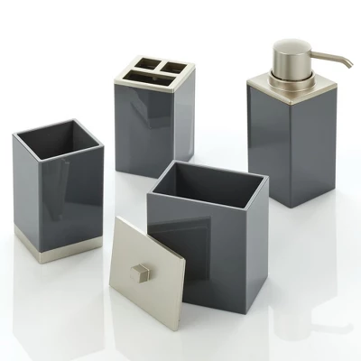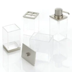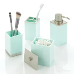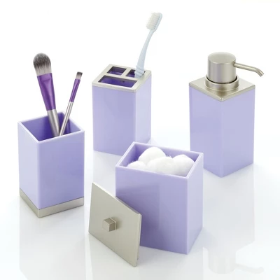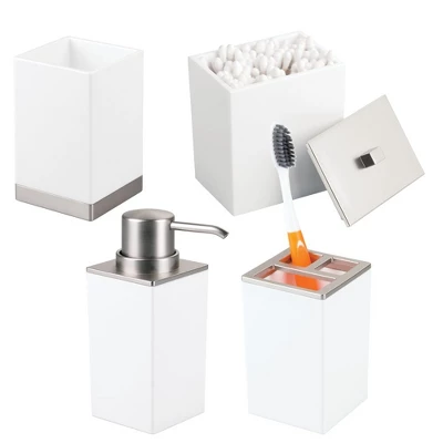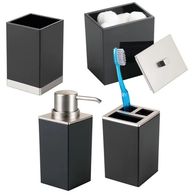 Make a style statement on your bathroom vanity or counter top with this Bathroom Accessory Set from mDesign. The soap dispenser holds up to 10 ounces of soap or lotion. The toothbrush holder has three slotted sections to keep toothbrushes separated and organized. The lidded storage canister is perfect for cotton balls, swabs and bath salts. Use the tumbler for drinking, rinsing, or makeup brush storage!