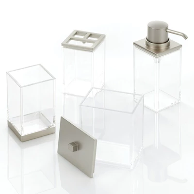 - 4-piece set includes 1 soap pump, 1 toothbrush holder, 1 tumbler cup, and 1 canister