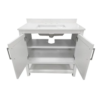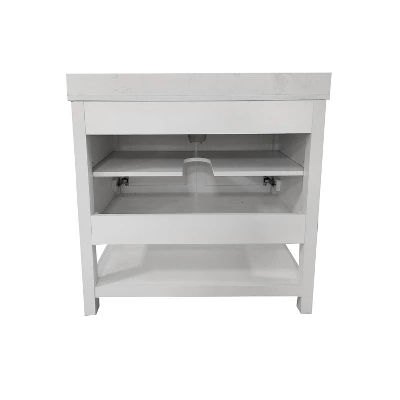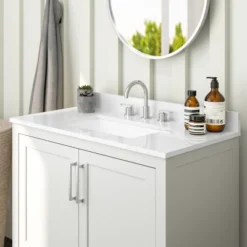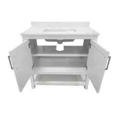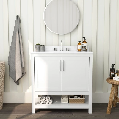 Add upmarket elegance to your bathroom with this highly styled and functional bathroom vanity. This single sink vanity features a stunning Carrara marble finished countertop, ceramic undermount sink, and optional backsplash, complemented by a moisture and warp-resistant engineered wood cabinet with soft close doors. Inside the cabinet, you’ll find an adjustable height shelf for storage while the outside boasts an open lower shelf for linens or decor. This vanity with sink arrives fully assembled right out of the box, simply remove the preassembled handles inside the cabinet and reinstall them outside