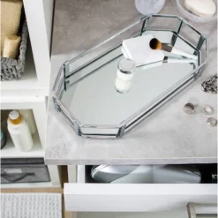 Don’t let scattered trinkets and overflowing cabinets ruin your bathroom decor with the Bathroom Tray from Home Details. Crafted from sturdy metal for durability and lasting use, this decorative bathroom tray features a chrome-finished, open octagonal design with a reflective glass base that brings a contemporary touch to your bathroom. Designed to fit your bathroom countertops, dressers or vanity, this bath accessory tray provides a stylish yet functional space to keep your perfume bottles, toiletries and medicine bottles neatly organized.