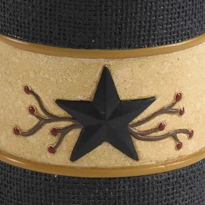 The Star Vine Toothbrush Holder features a black burlap textured base with a crackled wheat band that provides great contrast. The black star with berry vine motif adds country finesse and is elegantly designed. The opening has two wide compartments that are big enough to service electric toothbrushes. This is a perfect bathroom tool that is pretty and functional.