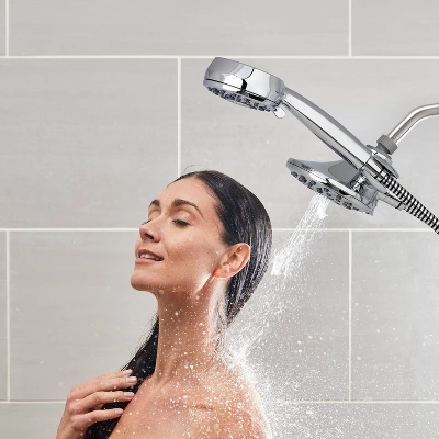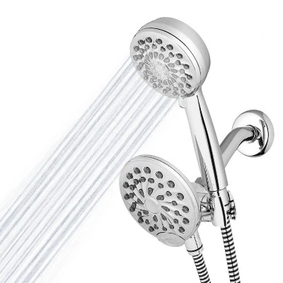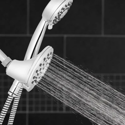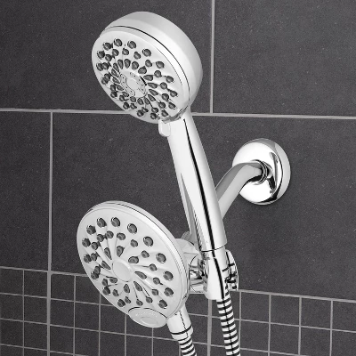 With one simple push of a button, choose between a luxurious rainfall shower head, a convenient hand held shower head, or use both at the same time with this Chrome 2-in-1 One Touch Combination Shower Head XPB-133E-763E. One Touch shower head switching technology is conveniently located on the front of the shower, making it easy to reach and simple to use – even with soapy hands.
