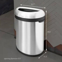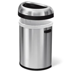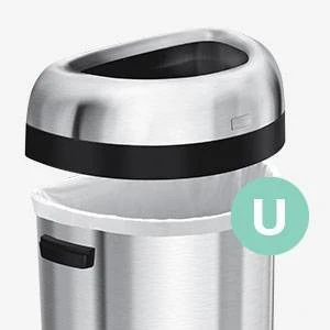 This large semi-round open can has a flat back for placement against the wall and out of the way, while its open lid design makes it easy to toss in trash on the go. The heavy-gauge stainless steel construction, lift-off lid, and extra-large capacity make it an ideal choice for commercial spaces such as restaurants and coffee shops, or even busy families. ADA-compliant. The code U liner fits this can perfectly — no bunching or slipping for a cleaner trash experience.