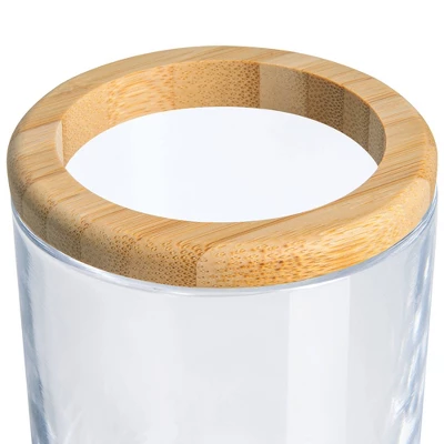 - Made of clear glass, bamboo top in a warm natural finish, one wide opening Finished size: 2.75" x 2.75" x 4.20" Use to store and organize your toothbrushes, toothpaste or other bathroom essentials