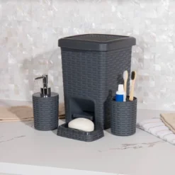 Establish your morning routine with this premium wicker-look bathroom set. Once you’ve grabbed your morning coffee, it’s time to wash your face with bar soap from the soap dish then pick up your toothbrush from the toothbrush holder. The liquid soap dispenser is ideal for regular hand soap, and the pedal bin allows you to toss waste away hands-free with the tap of your foot.