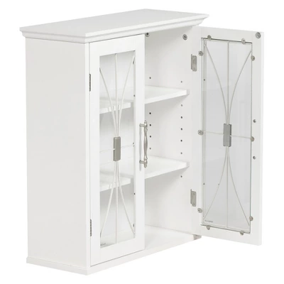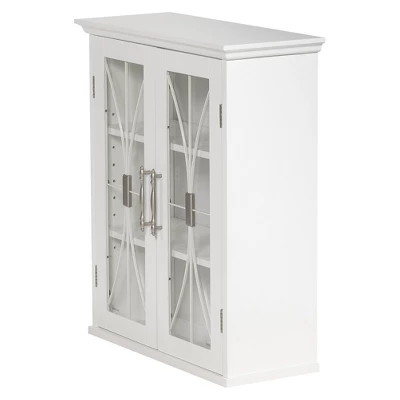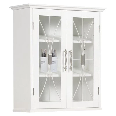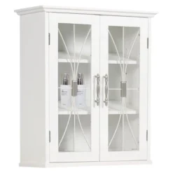 Upgrade your home storage while adding classic decor with the Elegant Home Fashions Delaney Wooden Removable Wall Cabinet with 2 Doors. This decorative cabinet features a white finish with a crown molded top, cathedral-style wire detail on the tempered glass-paneled doors, and metal knobs for a beautiful addition to your space. The 2 included adjustable shelves help to reduce clutter and keep your home tidy. Constructed from durable engineered wood, this wall cabinet is built to provide you with long-lasting organization. Easy, step-by-step instructions and all of the hardware needed are included for quick assembly. Purchase this stylish cabinet alone or with other items from the Delaney collection for a cohesive, updated look. The Elegant Home Fashions Delaney Wooden Removable Wall Cabinet with 2 Doors measures 8.5″ x 20.5″ x 24″ to provide removable storage without taking up too much space in your living area.