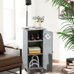Our floor storage cabinet with single door can add elegance and neatness to your living space! Featuring a wide tabletop and 3 compartments behind the door, this bathroom storage cabinet provides ample storage space for your daily items like towels, shampoo bottles, tissues, books, etc. Besides, the 3-position adjustable shelf allows you to store items with different heights. Made of premium MDF with exquisite workmanship, this bathroom floor cabinet ensures long-lasting use. 4 sturdy legs with anti-slip foot pads enhance the overall stability. The unique glass door design adds elegance and convenience. It can be placed anywhere in your home – bedroom, bathroom, living room or entryway to offer additional storage space.