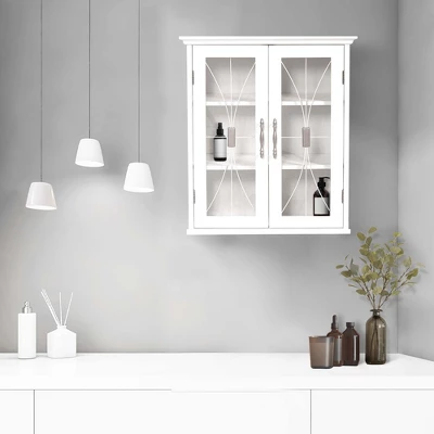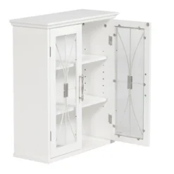 - STYLISH CABINET: Features a white finish with a crown molded top, cathedral-style wire detail on the tempered glass-paneled doors, and metal knobs for a beautiful addition to your space.