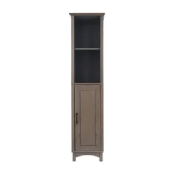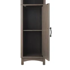 Upgrade your home storage while adding modern farmhouse decor with the Elegant Home Fashions Russell Modern Farmhouse Wooden Linen Tower Cabinet. This decorative cabinet features a rustic salt oak finish with paneled door and matte black pull for an elevated and stylish addition to your space. The adjustable open shelf and bottom cabinet provide storage for extra towels, bed linens, blankets, toiletries, and more to keep your home tidy. Constructed from durable engineered wood, this floor cabinet is built to provide you with long-lasting organization. Easy, step-by-step instructions and all of the hardware needed for installation are included for quick assembly. Purchase this stylish cabinet alone or with other items from the Russell collection for a cohesive, updated look. The Elegant Home Fashions Russell Wooden Linen Tower Cabinet with Open Shelving measures 13″ x 15″ x 62.75″ to provide accessible storage without taking up too much space in hallways or the bathroom.