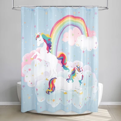- Magical print unicorns and rainbow themed design in lively multi-colors Enchant your child with this fairy-tale design making bath time more fun 100% polyester taffeta