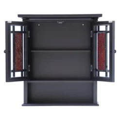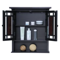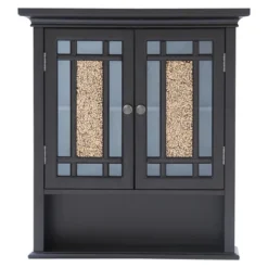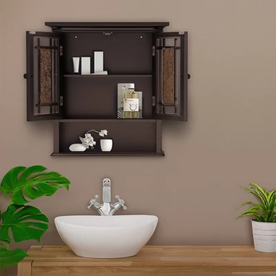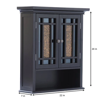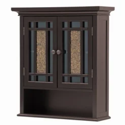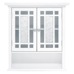 The Windsor Wall Cabinet will add style and organization to your bathroom. The crown molding has an extra sophisticated look, and the glass doors have a lovely frosted center pane. Two adjustable shelves and 3 compartments will beautifully store and display your items. The sturdy MDF composite has a painted finish and complementing bronze hardware for a polished look. Available in white or espresso.